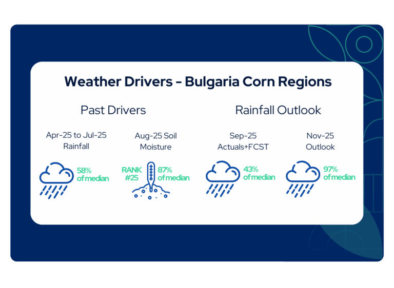 The latest estimate for Bulgarian corn production in the 2025/26 season has been reduced compared to the previous estimate by Octopusbot, largely driven by adverse weather conditions. The revision reflects the driest July and August months of the last 24 years, along with significantly below median rainfall during the crop’s critical planting and mid-season stages.