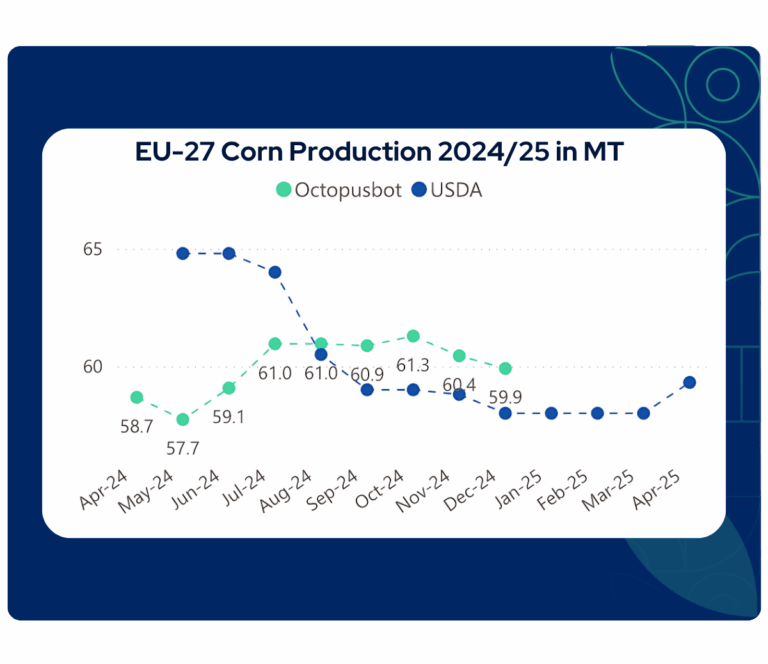 Since May 2025, Octopusbot has predicted declining Bulgarian corn production, a trend that official agencies are only reflecting now. Octopusbot’s AI models accurately captured and quantified the impact of extreme summer heat, prolonged drought, and depleted soil moisture on yields. Farmers had also reduced planted area after several consecutive years of low production, adding further pressure to output. As a result, these key drivers point to a significantly smaller crop than projected by the Ministry of Agriculture and the European Commission.