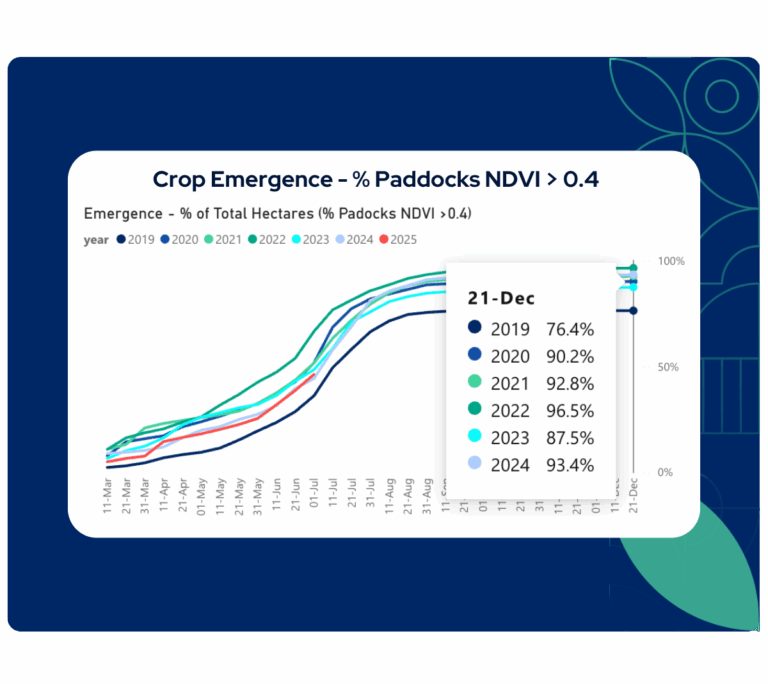 To determine emergence, we track how many paddocks in a region exceed an NDVI value of 0.4 – a widely accepted benchmark for early crop growth. This allows you to easily see how many paddocks have reached emergence in your region or compare progress across different zones.