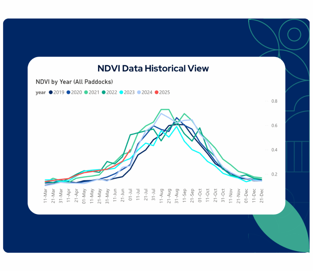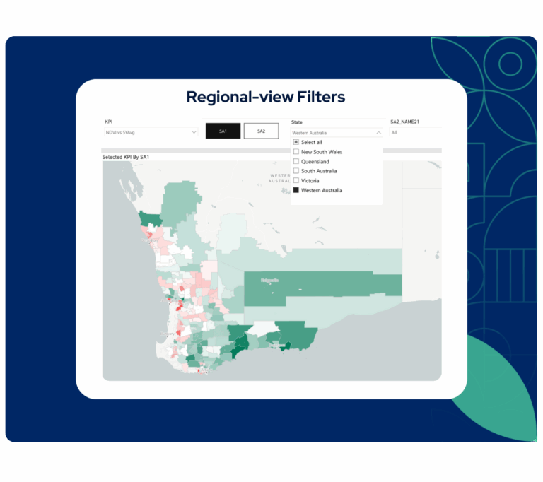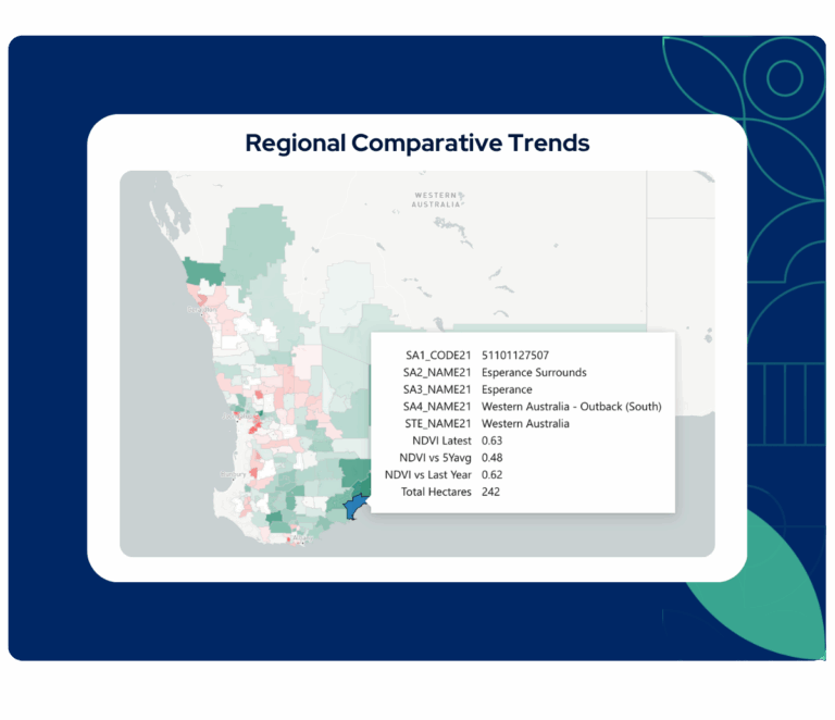We collect NDVI data for every paddock in the country and refresh it every 10 days. While we can drill down to individual paddocks, we aggregate data at the SA1 and SA2 regional levels to provide insights that are both scalable and actionable.