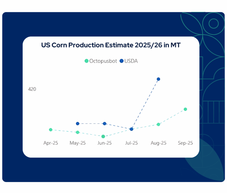 The gap between USDA’s record corn forecast and Octopusbot’s latest estimate reflects more than just numbers. It highlights the role of weather-driven modelling in capturing risks that emerge during the most critical stages of the season.