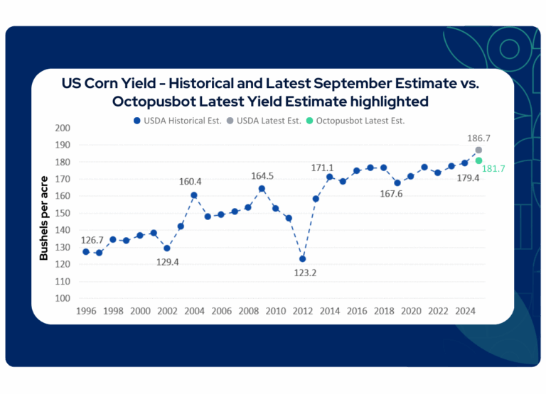 USDA’s estimate points to a record-high US corn yield of 186.7 bushels/acre, but Octopusbot’s assessment shows that this figure is not fully supported by the underlying indicators. Our current forecast stands at 181.7 bushels/acre, about 2.7% lower than USDA, reflecting a more data-driven assessment of late-season crop conditions.