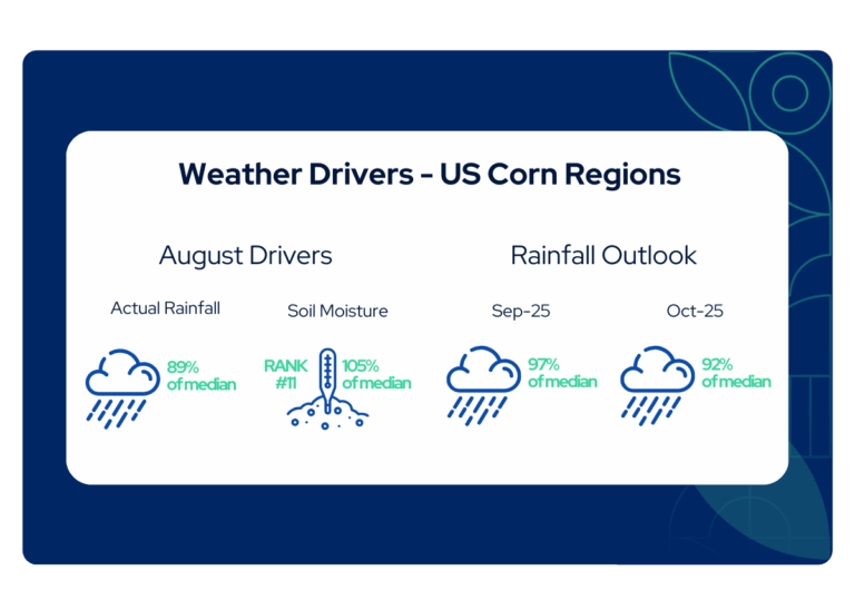 August compounded these pressures with extreme dryness across core producing states. Kentucky (28% of median), Tennessee (38% of median), and Ohio (41% of median) each recorded some of the lowest August rainfall in history. Nationally, precipitation averaged 2.30 inches, which is 0.32 inches below the long-term average, leaving soils critically depleted during the grain-fill period. These conditions constrained kernel development, negatively impacting the yields.