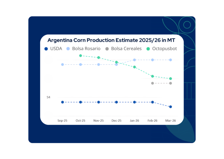 Historically, local Argentine agencies such as Bolsa de Cereales and Bolsa de Comercio de Rosario have tended to land closer to final production figures. The latest estimates from these agencies are also higher than USDA and broadly aligned with Octopusbot’s projections. Octopusbot’s estimate is 1.8% higher than Bolsa de Cereales and 6.5% lower than Bolsa de Comercio de Rosario, while the gap between these local estimates and USDA’s projection remains significantly wider.