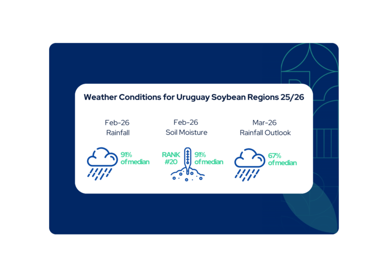 Octopusbot’s latest Uruguay soybean production estimate for the 2025/26 season has been revised downward compared to the previous update, mainly due to below-median rainfall in February 2026 (~91% of the median) and below-median soil moisture (~91%), ranking #20 driest of the last 24 years for this time of the season. The March rainfall outlook remains significantly dry (~67% of the median), adding further stress to the crop during key growth stages.