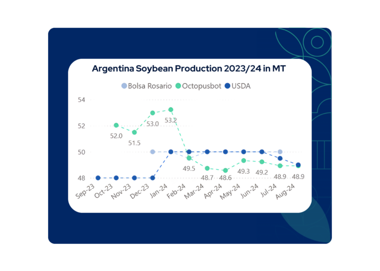 In November 2023, Octopusbot predicted the season’s production trend for Argentina soybean within 95% accuracy range, 9 months before the final estimate, with a difference of 0.2% on the final estimate.