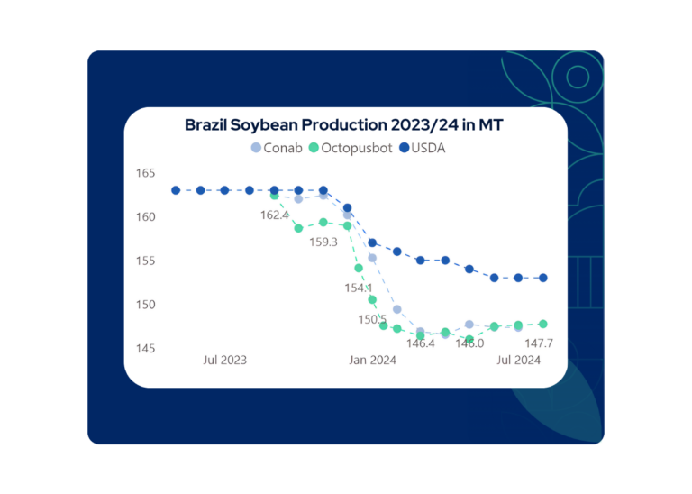 In December 2023, Octopusbot predicted the season’s production trend for Brazil soybean within 95% accuracy range, 8 months before the final estimate and 2 months before Conab, with a difference of 0.3% on the final estimate.