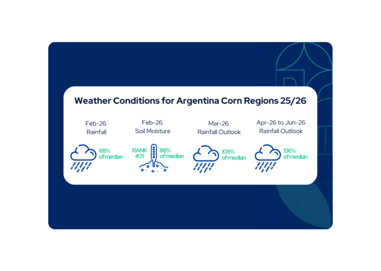 Despite a dry February, Argentina’s corn yields are projected higher than last year and the highest since 2020, mainly driven by the positive rainfall outlook from March through July (~125% of the median).