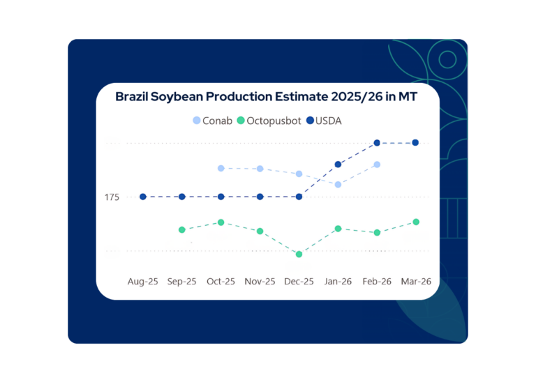 Octopusbot has consistently demonstrated strong forecast accuracy across South American crops, identifying production trends months ahead of traditional agencies.
