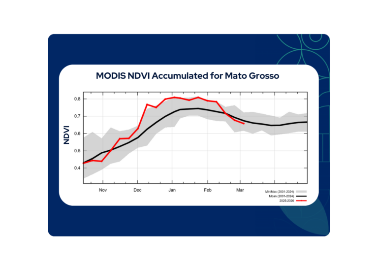 Seasonal biomass indicators also reflect these developments. MODIS NDVI readings are currently tracking below the historical mean (2001–2024) during the peak growth period, indicating weaker vegetation conditions across soybean areas.