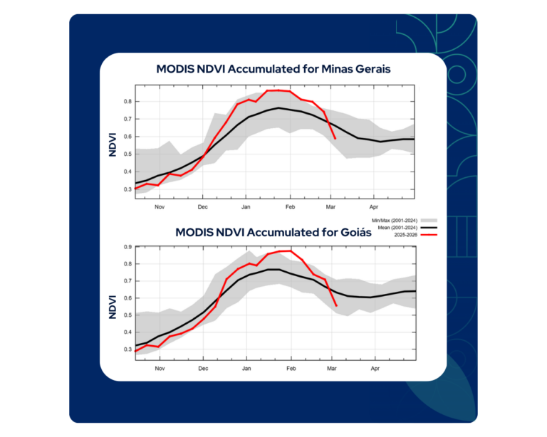 - Soil Moisture: National soil moisture levels remained close to the median (98%), while Goiás and Minas Gerais recorded above-median levels at 101% and 107%, respectively.